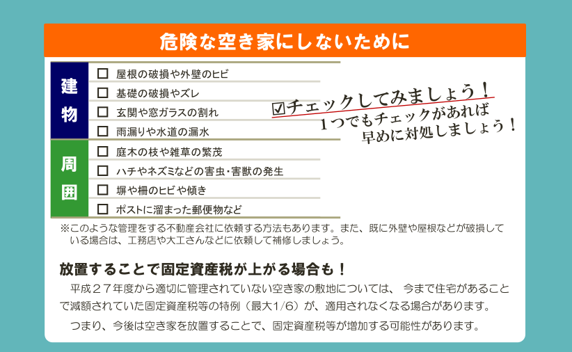 なるべくこまめに空き家の状態をチェックし、早めに対処することが肝心です。